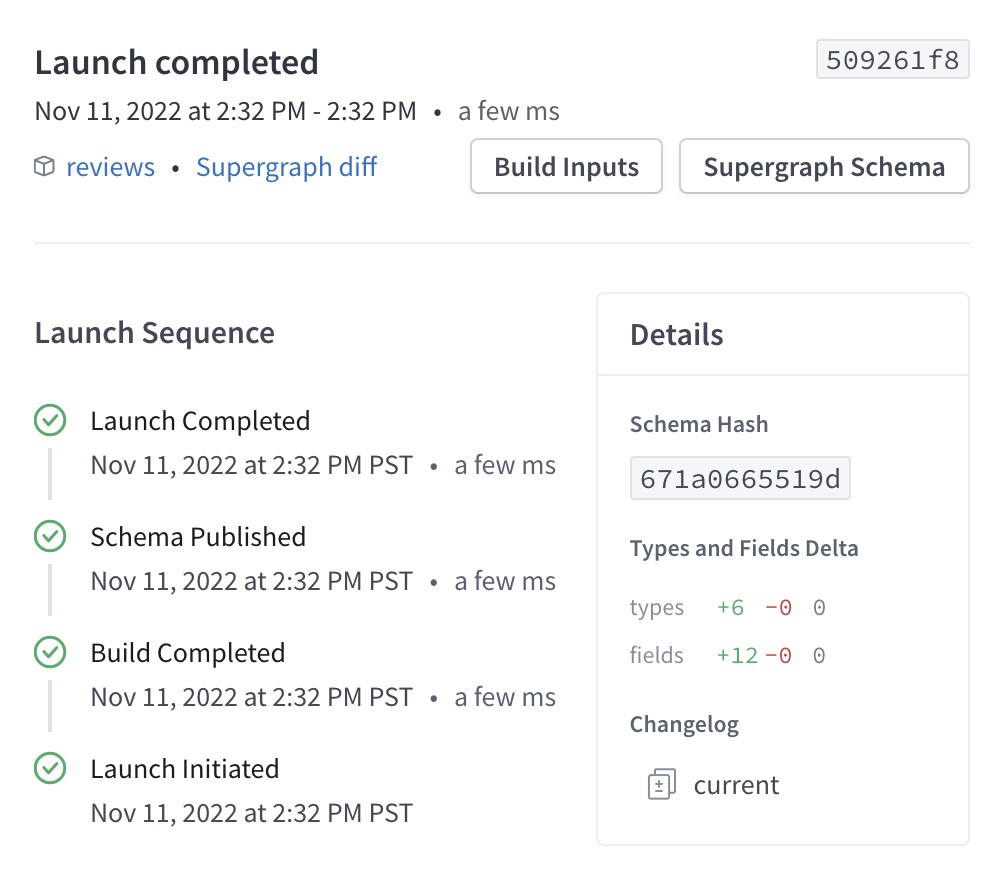 From this detail view, you can view the timestamp and other details for each step in the launch process. You can also view the launch's associated supergraph schema (or any build errors if composition failed).
